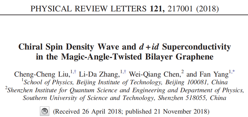 2018年11月21日,beat365中文官方网站物理学院由杨帆教授牵头,刘铖铖研究员、张力达副教授合作在物理学最顶级的权威期刊《Physical Review Letters》(IF="8.839)上发表了题为《Chiral" Spin Density Wave and d+id Superconductivity in the Magic-Angle-Twisted Bilayer Graphene》的研究论文。这篇论文对于今年新发现的魔角双层石墨烯中的非常规高温超导现象提出一种新的理论机制,获得国际学术界的广泛认同和跟进,成为目前该研究领域的重要理论之一(在Google Scholar上已被引用21次)。