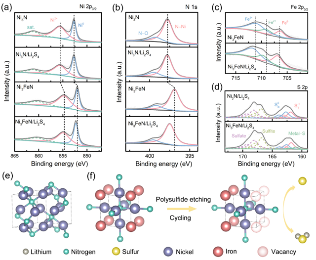 类似于金属催化剂设计的合金化策略,该团队在单金属化合物中引入外在金属,活化了原来的惰性相化合物,从而促进多硫化物的表面反应动力学。以六方氮化镍(Ni3N)作为概念验证,其对多硫化物的催化活性较差。在引入铁元素后,Ni3N转变为高活性的立方镍铁氮化物(Ni3FeN)。在Ni3FeN中,处于立方结构顶角处的较高正电性的铁(与镍相比)倾向于通过多硫化物的刻蚀过程浸出,从而在镍位点的周围留下大量空位缺陷,极大地提高了Ni3N的催化活性。