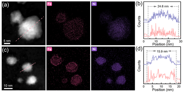 图2.(a,b)循环前和(c,d)循环后Ni3FeN-G的HAADF-STEM图像和相应的元素分布