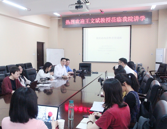 5月14日下午,北京外国语大学中国外语与教育研究中心王文斌教授受邀莅临beat365中文官方网站外国语学院,并于中心教学楼515会议室作了题为“英汉语内在性差异透析”的学术报告。外国语学院院长李京廉教授主持了本次报告会,副院长姜爱红教授、英语专业教研室、研究生英语教研室的教师和英语专业的本科生、研究生参加了此次讲座。