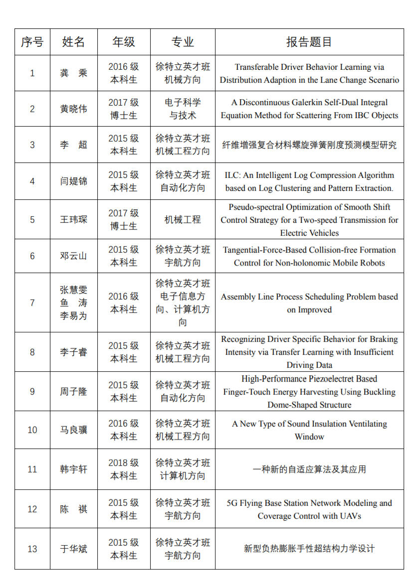 在下午分论坛学术交流环节,13名同学分两组在分会场作报告,17级博士生王玮琛的电动汽车平滑换挡优化研究了电动汽车的平稳换挡控制策略,优化控制后离合器发动机换挡挺度可提高约60%,可以较好的跟踪最优解的运动轨迹,具有实时性和有效性;15级本科生李子睿通过迁移学习的手段,实现了通过少量数据的输入完成从成熟的驾驶员模型到新的个性化驾驶员模型的转变,而且通过改进算法,实现了少数据量下80%以上的预测准确度,高于其他方法的70%,完成了算法层的突破;18级本科生韩宇轩,对传统的数值积分公式做出了自适应算法上的改进,展现出非同寻常的科研创新热情和能力。论文交流后,现场评委老师对大家的报告进行了点评:杨国孝十分认可同学们取得的成果,肯定了徐特立学院学子科研中展现出的学科融合的特点;胡纪滨肯定了大家的学术精神,并希望大家继续保持蓬勃的求知欲,多问几个为什么,研究课题的目的是什么,用的定理是怎么来的。
