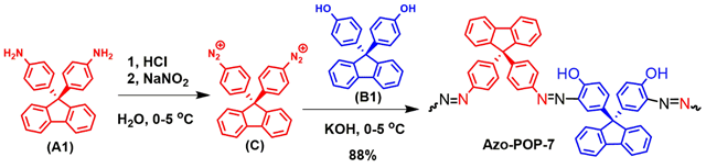 然而,目前报道的大部分有机多孔聚合物不熔融不溶解,一定程度上限制了其进一步应用。因此,从分子链的扭曲构象出发,以“逆合成”的思路选择合适的聚合物单体和高效的聚合反应,制备新型的可溶性有机多孔聚合物材料,对推进有机多孔聚合物材料领域的研究具有重要意义,也成为一个研究热点。最近,黄木华课题组利用重氮偶联反应,从具有扭曲构象的9,9-二(4-羟基苯基)芴和9,9-二(4-胺基苯基)芴单体出发,实现了偶氮键链接的可溶性有机多孔聚合物材料Azo-POP-7的快速制备(图1)。