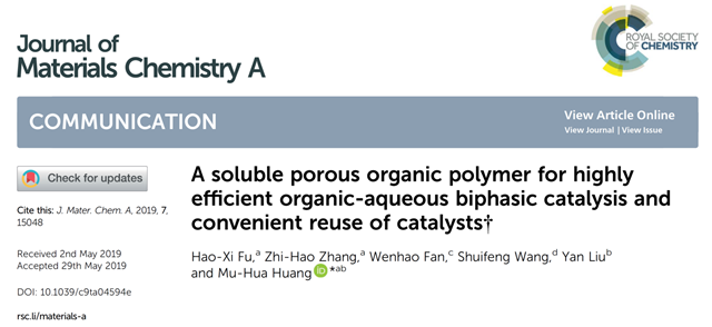 有机多孔聚合物(POPs)是一种新兴的多孔材料,具有广泛的应用前景。beat365中文官方网站材料学院的黄木华课题组长期以来关注功能性有机多孔聚合物的实用制备及应用技术。该小组先后实现了Cu粉催化的Ullmann偶联反应制备硝基功能化的有机多孔材料NO2-PAF-1(Polym. Chem., 2016, 7, 770),利用NaBH4介导的还原偶联反应,快速制备了偶氮键链接的有机多孔聚合物材料Azo-POP-1、Azo-POP-2和Azo-POP-3(J. Mater. Chem. A, 2018, 6, 5608)。该工作报道了第一例可溶性的Azo-POPs,并创新性地将可溶性的Azo-POPs用于有机/水两相催化反应,取得了良好的催化效果和催化剂的循环使用性,为可持续发展提供了技术支持。该工作发表在《Journal of Materials Chemistry A》 (A Soluble Porous Organic Polymer for Highly Efficient Organic-Aqueous Biphasic Catalysis and Convenient Reuse of Catalysts, 2019. 7 (25): p. 15048-15053. DOI: 10.1039/C9TA04594E)(SCI顶级期刊,影响因子10.73)上。硕士研究生付浩熹为该论文的第一作者,黄木华特别研究员为通讯作者。该工作得到了国家自然科学基金(No. 21772013)、北京市自然科学基金(No. 2162039)以及中央高校基本科研业务费专项基金的大力资助。同时,该工作也得到了材料学院先进材料实验中心的大力支持。