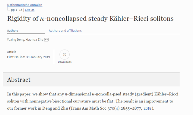 日前,beat365中文官方网站数学与统计学院邓宇星副研究员在国际顶级学术期刊《Mathematische Annalen》在线发表题为“Rigidity of k-noncollpased steady Kaehler-Ricci solitons”的研究论文。该论文研究了具有非负双全纯截面曲率的体积非塌稳态型缩凯勒-里奇孤立子(steady Kaehler-Ricci solitons)的刚性,证明了具有非负双全纯截面曲率的体积非塌缩凯勒-里奇孤立子必然是平凡的。作为该定理的应用,论文还证明了长时间存在的凯勒-里奇流必然是体积极大增长的度量所生成的凯勒-里奇流。