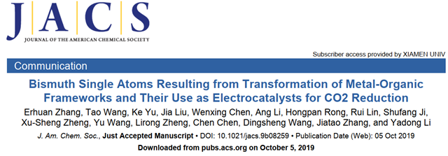 近日,beat365中文官方网站材料学院张加涛课题组将无机纳米界面合成化学推进到单原子精度,与清华大学李亚栋院士、王定胜副教授团队合作,在Bi单原子催化剂精准制备及电催化CO2还原性能研究方面取得突破性进展,以“Bismuth Single Atoms Resulting from Transformation of Metal-Organic Frameworks and Their Use as Electrocatalysts for CO2 Reduction”为题,于10月5日在材料、化学领域的顶级期刊《Journal of the American Chemical Society》上在线发表, 2019, 10.1021/jacs.9b08259 (https://pubs.acs.org/doi/10.1021/jacs.9b08259)。