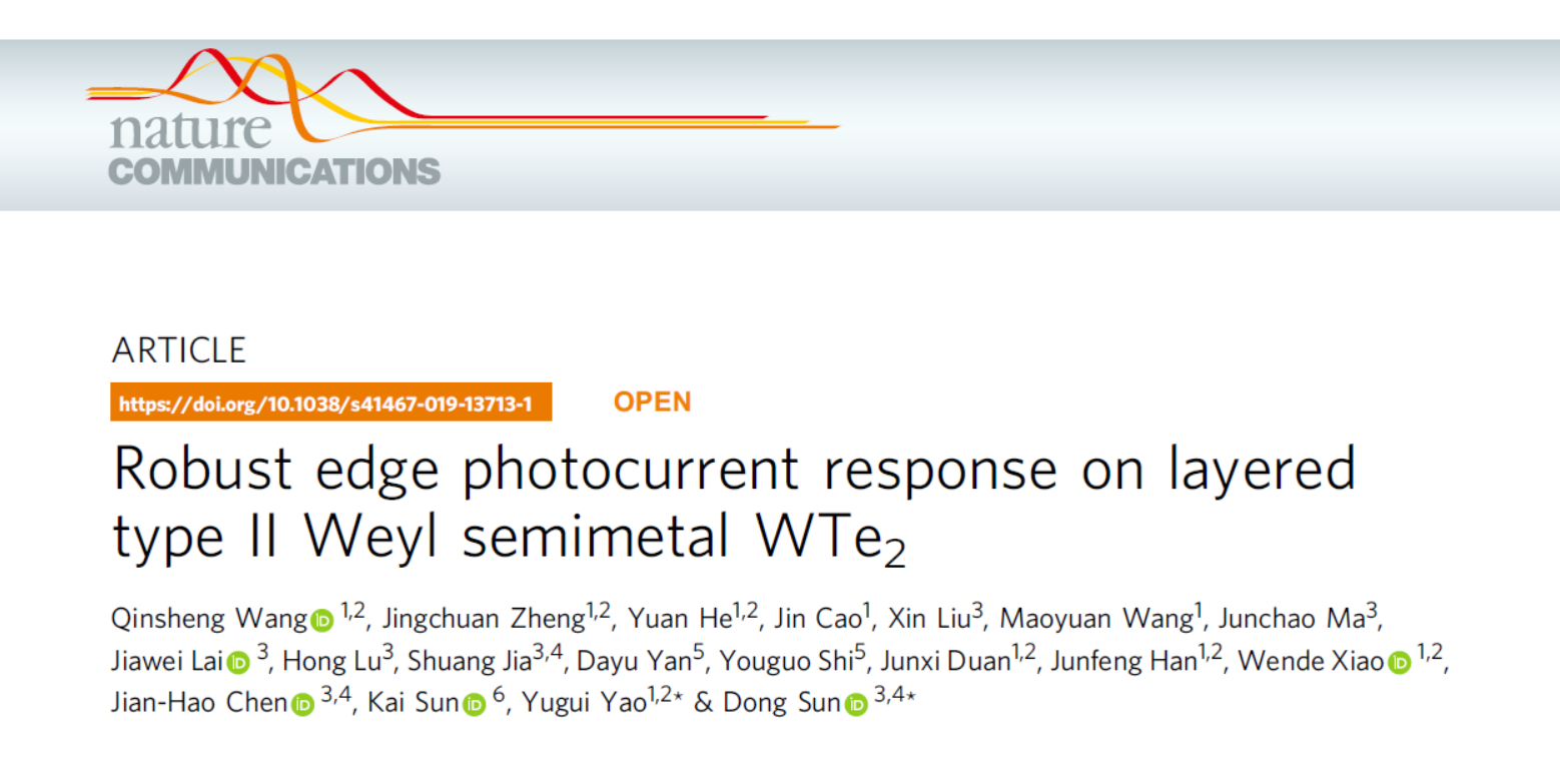 近日,beat365中文官方网站物理学院姚裕贵教授、王钦生特别副研究员及团队成员,同北京大学量子材料中心孙栋研究员等合作者,在第二类外尔半金属材料WTe2光电响应研究方面取得重要进展。他们利用扫描光电流谱方法对第二类外尔半金属材料WTe2光电响应进行了系统的研究,发现在该材料边界处具有反常的光电流响应(图1),并且边界对称性的高低决定了该反常光电流响应的有无。该工作提出了利用材料低对称性边界的晶体场作为光生电子-空穴对分离的有效手段,并讨论了拓扑边缘态对于光电响应的可能影响,为拓扑半金属材料在光电探测等方面的应用提供了新的思路。相关成果最近发表在Nature Communications上。