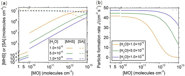 图2(a)不同水浓度下,由SO3生成的硫酸甲酯(MHS)和硫酸(SA)的浓度(cm-3)随甲醇(MO)浓度的变化。(b)不同水浓度下,粒子形成速率J (cm-3 s-1)随着 MO浓度的变化。