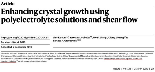 近日,beat365中文官方网站化学与化工学院孙建科教授以《Enhancing crystal growth using polyelectrolyte solutions and shear flow》为题,将其“剪切促进晶体生长”研究成果发表于《Nature》杂志上(Nature 2020, 579, 73-79)。孙建科为该论文的共同第一作者,化学与化工学院为共同合作单位,排名第三。此研究是与韩国基础科学研究院Bartosz Grzybowski 教授合作完成。