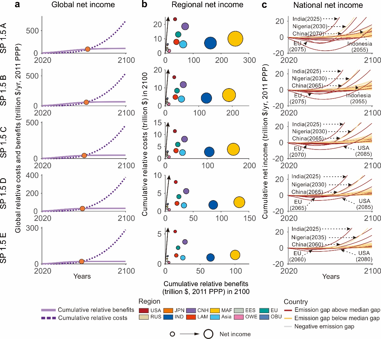 自我防护策略下全球、区域和国家可获得的净收益及扭亏为盈时间