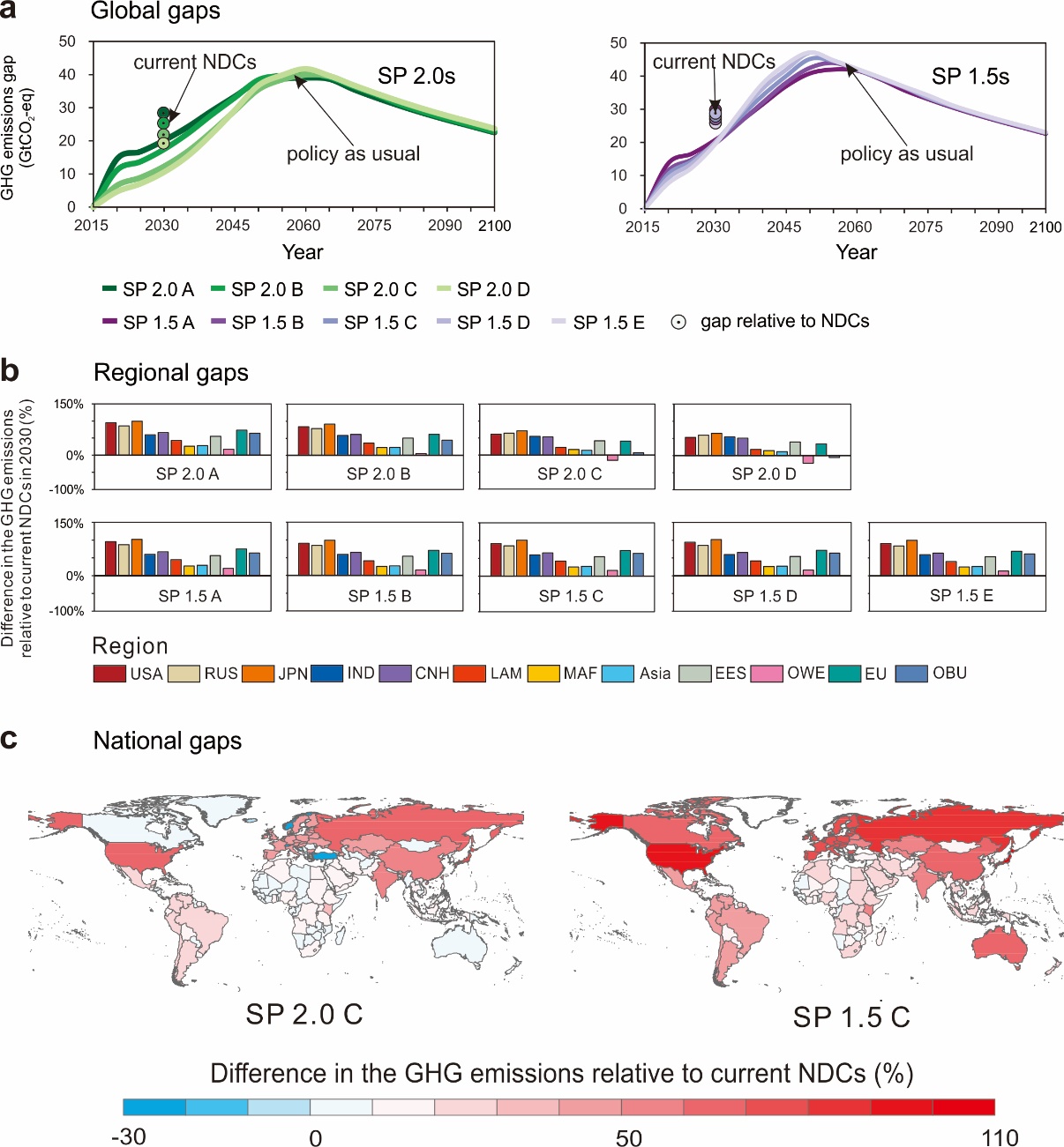 就目前而言,大部分国家自主减排目标缺乏雄心。为了实现长期温控目标和经济收益,2030年,全球需要在现有NDC基础上进一步减排19-29和28-30吉吨二氧化碳当量以实现2度和1.5度温控目标。所有国家和地区均需在现有NDC基础上进一步提高减排力度。其中,日本、美国、俄罗斯、欧盟、中国需要付出更多的努力,在本世纪中叶之前需要实现净零排放。