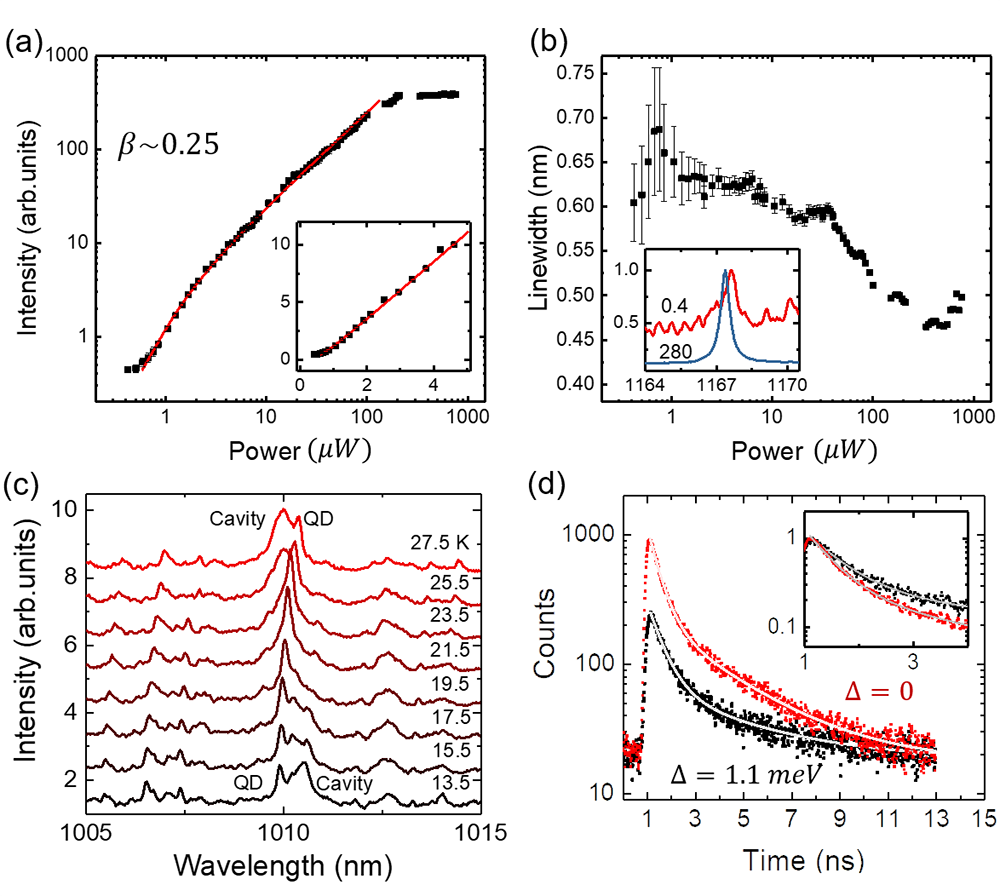 图(2)(a,b)拓扑激光。拓扑角态荧光强度(a)和线宽(b)随激发功率的变化。阈值约为1μW。(c,d)单个量子点与拓扑角态的弱耦合。(c)不同温度下的荧光光谱。当量子点(QD)与腔共振时,荧光强度增强约4倍。(d)共振(红色)与非共振(黑色)状态下的荧光衰减曲线。共振时的衰减速率约为非共振时的1.3倍