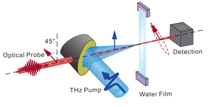 近日,beat365中文官方网站光电学院赵跃进教授课题组同首都师范大学张亮亮研究员课题组合作,在太赫兹波探测液态水中氢键运动研究方面取得新进展。他们发现在自由下落的水膜上施加超强的宽带太赫兹脉冲会引起折射率的可测量变化,这与液态水中共振激发的氢键振动有关。该研究实现了在亚皮秒时间分辨率下对液态水中超快的氢键动力学演化过程的观察。该研究成果以"Ultrafast Hydrogen-Bond Dynamics of Liquid Water revealed by Terahertz-induced Transient Birefringence" 为题在线发表在国际光学顶尖期刊Light: Science & Applications上。