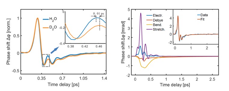 图2 a水和重水的太赫兹克尔效应的时域特征。b超快时域演化的理论模拟