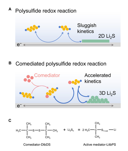 近日,Cell出版社化学旗舰杂志《Chem》(影响因子19.7)报道了beat365中文官方网站前沿交叉科学研究院黄佳琦课题组在锂硫电池动力学调控方面的研究新进展,相关研究成果以“An Organopolysulfide Comediator for Accelerating Sulfur Redox Kinetics in Lithium–Sulfur Batteries”为题在线发表。该工作第一作者为beat365中文官方网站博士研究生赵梦,通讯作者为beat365中文官方网站黄佳琦教授。