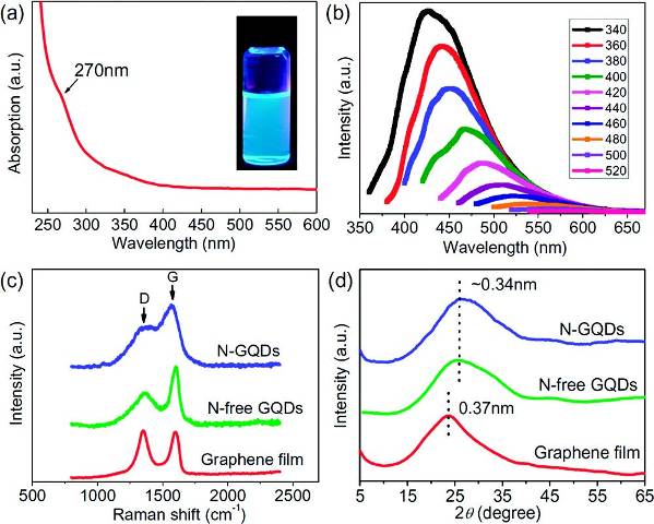 曲良体教授科研团队建立了一个简单的电化学方法实现了含富氧功能基团的氮掺杂石墨烯量子点的制备,它同时具备荧光和电催化氧还原反应的活性。与未掺杂状态相比,新的石墨烯量子点氮/碳原子比约为4.3%,可以激发出蓝色荧光,而且在碱性介质中具备可与市售Pt/C催化剂相比拟的氧化还原催化活性。这一研究通过实现了氮掺杂对量子点光电学性质的调控,同时也开拓了其在氧化还原催化剂方面的应用。这些特性使其可以作为燃料电池中的催化剂,以及应用于生物医学成像领域。