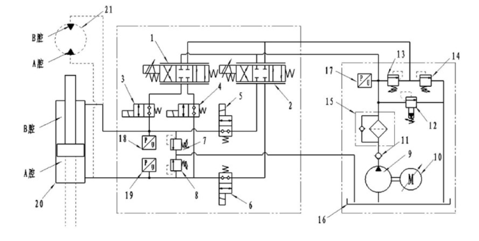 1 第一电液伺服阀,2 第二电液伺服阀,3 第一两位两通电磁阀,4 第二两位两通电磁阀,5 第三两位两通电磁阀,6 第四两位两通电磁阀,7 第一压力阀,8 第二压力阀,9 液压泵,10 伺服电机,11 单向阀,12 比例溢流阀,13 减压阀,14 第三压力阀,15 过滤器,16 油箱,17 第一压力传感器,18 第二压力传感器,19 第三压力传感器,20 液压缸,21 液压马达