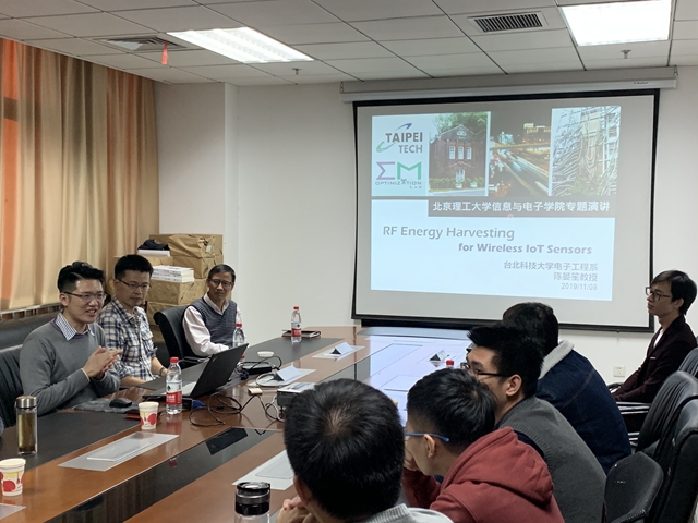 11月8日下午,beat365中文官方网站信息与电子学院联合研究生院邀请台北科技大学电子工程系陈晏笙(Yen-Sheng Chen)教授、曾柏轩(Po-Hsuan Tseng)教授来校进行学术交流。陈晏笙教授应邀做了题为“RF Energy Harvesting for Wireless IoT Sensors”的“21世纪学科前沿”系列学术报告。出席此次会议的有信息与电子学院王华教授等十余名教师、博士研究生和硕士研究生。