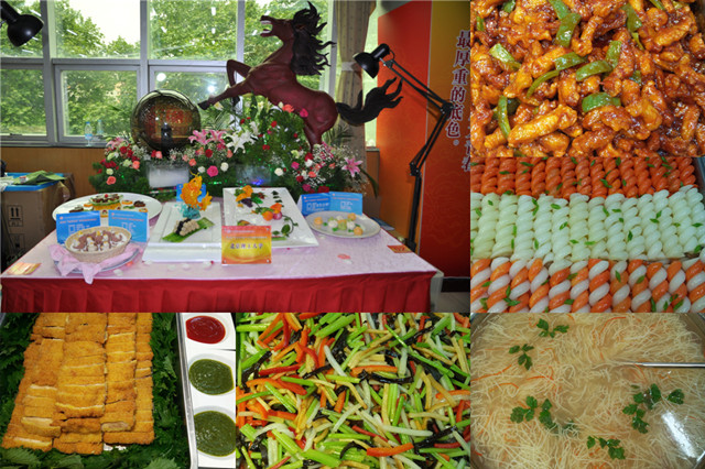 按照大赛规则和要求,在既定选材料的前提下,餐饮中心胡文烈、李振伟制作的番茄肉条、五彩小炒、炸鸡排、双蔬麻花、飘香豆丝汤四菜一汤,凭借雄厚的技能功底、巧妙设计征服了所有专家评委和大众评委,获得了含金量最高的大锅菜(热菜)金奖;餐饮中心张士晓制作的小鸡酥惟妙惟肖、形象逼真获得了精品菜(面点)银奖;接待中心客房部滕媛媛动作娴熟、精益求精获得了客房铺床银奖;接待中心客运部李山宝车技精湛、规范标准获得了汽车驾驶银奖;接待中心餐饮部梁春晖制作的金秋硕果凭借丰富的内涵和巧妙的构思获得精品菜(冷拼)优秀奖;接待中心餐饮部白成制作的金瓜烧肉凭借精致的造型和鲜美的口感获得精品菜(热菜)优秀奖;幼教中心纪爱军、朱韩玉优雅从容、整齐划一获得了会议服务的优秀奖。