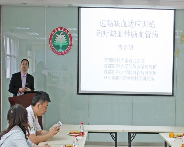 仪式结束后,吉训明教授向生命学院研究生介绍了宣武医院的概况和国家卒中抢救与治疗指导中心的服务平台,并作了一场题为“远隔缺血适应训练治疗缺血性脑血管病”的学术报告。报告对缺血适应的由来以及缺血适应训练治疗对缺血性脑血管病的作用进行了讲解,对老年多发的卒中疾病进行了科普讲解,参加报告的老师同学对远隔缺血预适应的影响等方面进行了积极的讨论。