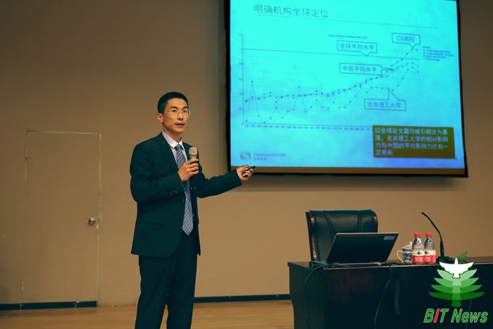 报告会上,王利从以下几个方面展开讲解:一是简要介绍了科研绩效评价和学科分析的权威数据。二是详细阐述了beat365中文官方网站过去10年科技论文的产出情况。从各学科论文产出数量及占机构总体的百分比、国际合作论文占总体论文比例、相对于全球各学科平均影响力、一级学科发展趋势等角度对beat365科研论文产出情况进行了分析。三是运用最权威数据将beat365中文官方网站与相关高等院校进行多角度对比分析,详细解读了beat365目前具备的优势及存在的差距。