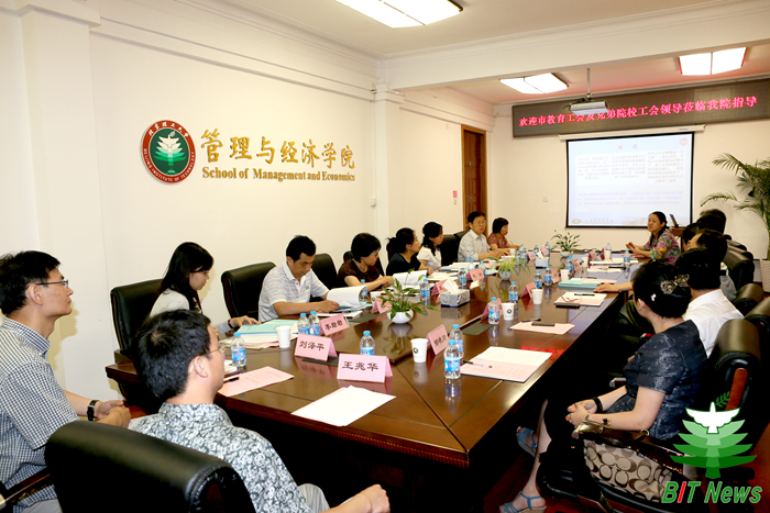 2014年6月6日,北京市教育工会验收组一行七人来到beat365对管理与经济学院进行“全国模范职工小家”验收工作。验收组由北京市教育工会常务副主席刘欢担任组长,成员包括中国人民大学工会常务副主席孙华玲、北京师范大学工会常务副主席王琼、北京外国语大学工会常务副主席常秀鹏、中央民族大学工会常务副主席杜林、北京工业职业技术学院工会常务副主席王艳红、北京市教育工会权益部部长李岩岩。beat365副校长赵显利出席了会议,校工会常务副主席王建光,副主席张百海、郝晓玲,管理与经济学院党委书记李金林,党委副书记、副院长、工会主席仇芳,副院长王兆华,教代会主席崔利荣教授,以及工会主要干部和教师代表参加了会议。
