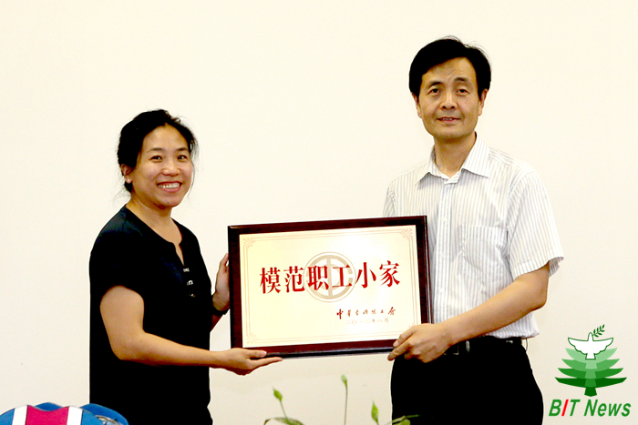 授牌仪式上,李金林作为管理与经济学院代表,在刘欢手中接过了“全国模范职工小家”牌匾。