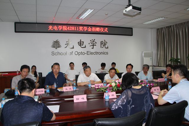 2014年7月7日下午,光电学院42811奖学金捐赠仪式在信息楼2023会议室举行。该奖学金由光电学院42811班校友捐赠,奖励光电学院品学兼优的本科生和研究生。副校长杨宾,学校对外工作委员会主任焦文俊,校友会办公室主任段丽萍,校基金会主任罗雪,42811班校友代表王双、吴志敏、孙文龙、梁列国,光电学院党委书记郝群、副书记副院长邹锐和学生代表参加了捐赠仪式。