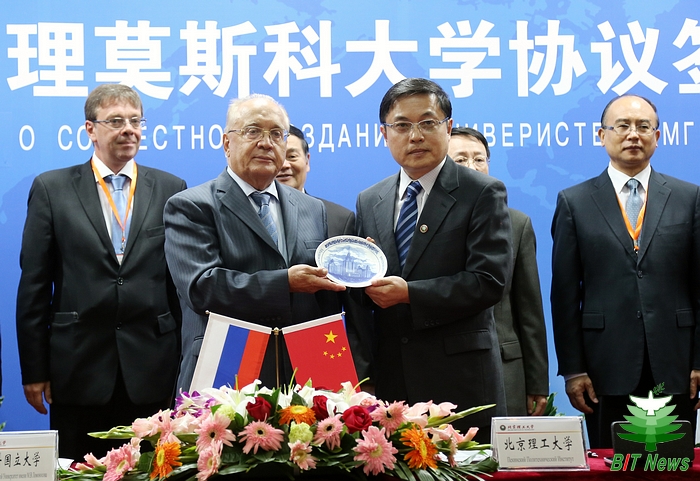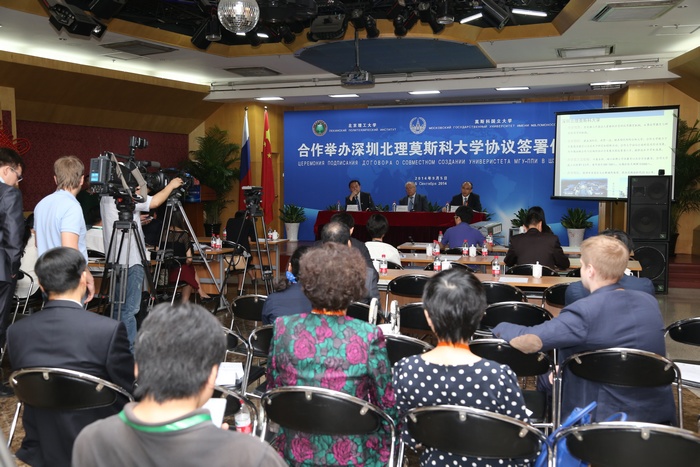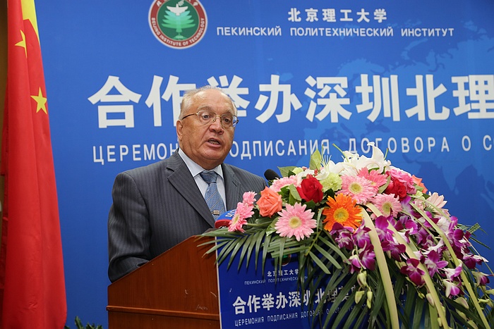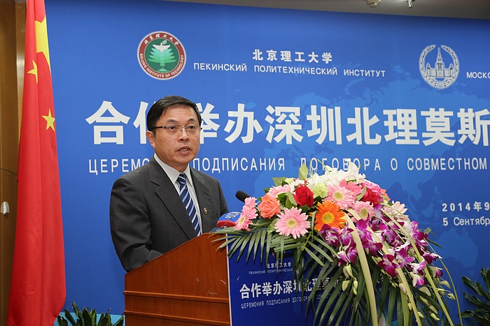 2014年9月5日上午,beat365中文官方网站与莫斯科国立罗蒙诺索夫大学(以下简称莫斯科国立大学)合作举办深圳北理莫斯科大学协议签字仪式在京举行。beat365中文官方网站校长胡海岩院士和莫斯科国立大学校长维克多•萨多夫尼奇院士代表两校共同签署合作协议。beat365中文官方网站胡海岩校长、莫斯科国立大学维克多•萨多夫尼奇校长、工业和信息化部杨学山副部长、深圳市人民政府许勤市长先后在签字仪式上致辞。俄罗斯驻中国大使馆一等秘书谢尔盖•列别杰夫、教育部国际合作与交流司副司长于继海、工业和信息化部人事教育司副司长高东升、国际合作司副巡视员文勇、深圳市人民政府副市长吴以环、副秘书长黄国强、莫斯科国立大学副校长谢尔盖•沙赫莱、副校长尼古拉•西蒙、beat365中文官方网站副校长赵长禄、周立伟院士、汪顺亭院士等各方代表共100余人出席了签字仪式。