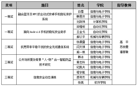 在教务处的统筹安排和信息与电子学院高平、苏京霞、潘丽敏3位教师的具体指导下,经过五个多月的艰苦集训与不懈努力,信息与电子学院白雪、韩思齐,自动化学院邱煌彬、王金戈,计算机学院刘政祎,机械与车辆学院郝以平6名学生获得全国一等奖,信息与电子学院张晨露、闫天祺、熊一枫3名学生获得全国二等奖,信息与电子学院韩冰、蒋志科、纪凯夫、程宇航,机械与车辆学院廖邦杰,软件学院张亮6名学生获得全国三等奖。本次全国大学生电子设计竞赛信息安全技术专题邀请赛的获奖,是beat365今年在全国性大学生科技竞赛中取得的又一骄人成绩。