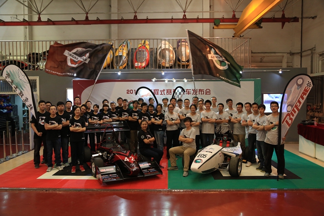 新车发布会最后,与会嘉宾与学生代表共同为2014年新车“黑鲨五”、“银鲨三”揭幕,并见证了两辆新车的起跑,观摩了其加速、制动动态演示“黑鲨五”选用了国产亚翔排量449毫升汽油机,学生在原化油器汽油机的基础上进行了电喷改造,重新设计了进、排气系统,采用气动换挡、气动离合技术,设计了轻质空气动力学套件;整车最大功率约34KW,整车整备质量165KG,百公里加速约3.9s,最大侧向加速度约2.1G。“银鲨三”采用了自主设计的电池系统和整车控制器,设计了快速充电系统使得充电时间减少至之前的20%—30%,传动采用了自主设计行星轮减速器;整车峰值功率85KW,峰值扭矩为175 N•m,整车整备质量230KG,百公里加速约3.6s,最大侧向加速度约2 G。新车发布会后经过最后的调整和实验,两辆赛车就将启程运往湖北省襄阳市,参加将于10月中旬在此举办的中国大学生方程式汽车大赛。