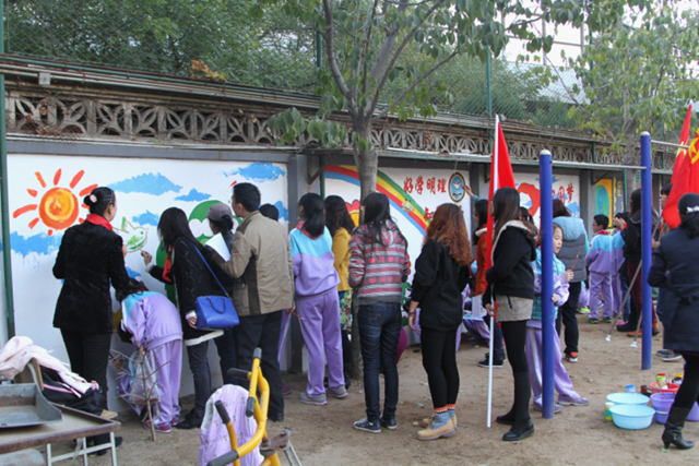 本次主题绘画活动包含了“社会主义核心价值观”、“理工附小校训——‘好学明理,知行有爱’”、“红领巾相约中国梦”三方面的内容。设计学院的同学们充分发挥专业优势,从画稿的设计到方案的实施得到了双方领导、学生家长以及小朋友们的一致认可。活动开始后,大家纷纷拿起画笔在设计学院同学们的指导下参与到墙体的绘制中,有人在调色,有人在勾勒,有人在涂色,有人在修型,有人在帮忙涮笔,现场气氛真是热烈、和谐而又欢乐。大朋友们的积极投入,小朋友们认真描绘,成了小学校园里的一道独特风景。