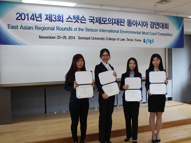 2014年11月25-29日,第19届国际环境法模拟法庭大赛(International Environmental Moot Court Competition, IEMCC)东亚地区选拔赛在韩国首尔举行。由法学院张艳丽副院长、环境法所所长罗丽教授、张晏老师带领的2011级学生张晗、张航、王蔚、王安琪、蔡文组成的beat365中文官方网站代表队参加了此次竞赛,并取得优异成绩,王蔚同学以出色表现获得“最佳辩手”的奖项。