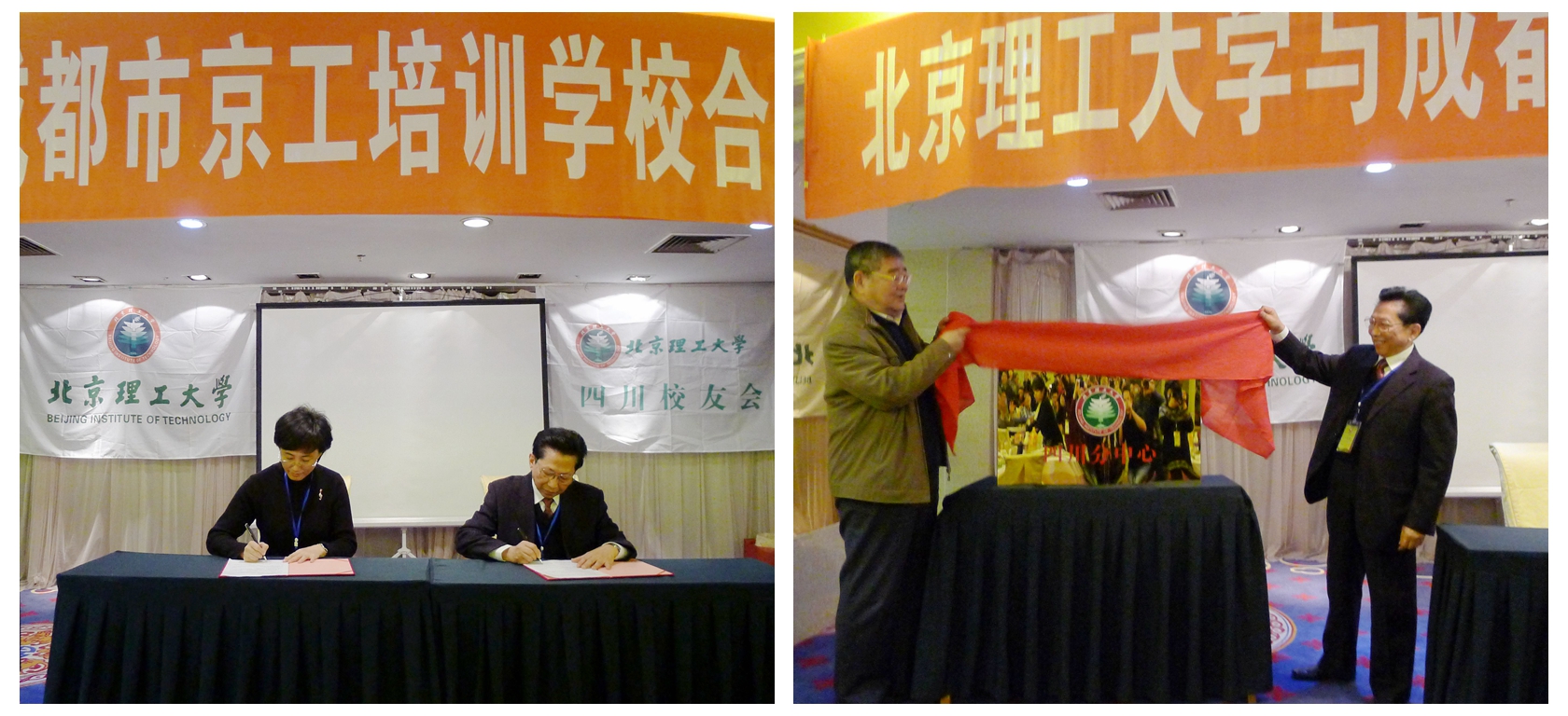 beat365中文官方网站继续教育学院史彦主任和四川校友会邹名高会长共同签署了beat365中文官方网站教育培训中心四川分中心——成都市京工培训学校成立文件,学校原党委书记焦文俊和邹名高会长共同为成都市京工培训中心揭牌。2013年座谈会中,四川校友们一致希望并建议母校能在成都——这个西南地区的中心规划并创建一个教育培训中心,以适应国家实施西部大开发的战略需要及西南地区国防高端人才培养的强烈需求,并扩大学校的社会影响力。经过近两年的筹备、策划,如今由母校与校友共同合办的成都市京工培训学校终于成立了。