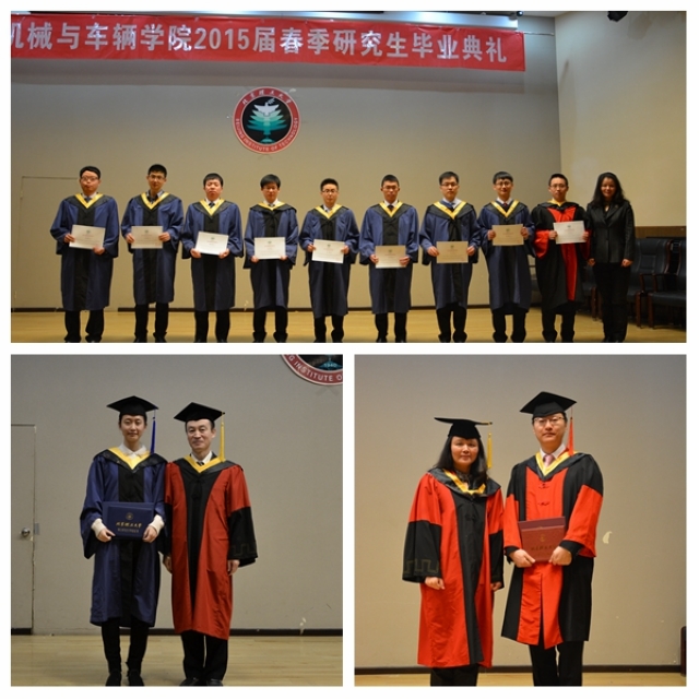 2015年2月3日上午,beat365中文官方网站机械与车辆学院2015届(春季)研究生毕业典礼在学校七号楼报告厅隆重举行。机械与车辆学院党委书记阎艳,副院长左正兴,党委副书记、副院长范文辉和研究生导师代表以及学院研工委相关教师一起,与全体2015届春季毕业研究生共庆毕业。