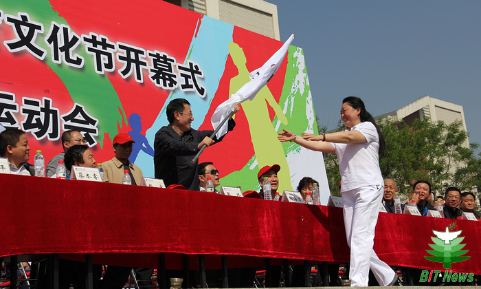 入场式结束后,校党委书记张炜将“体育文化节”旗帜授给教师代表北京市教学名师李林英,开始了传承接力活动。北京市教学名师李林英、长江学者奖励计划特聘教授龙腾、校男子足球队原队长自动化学院辅导员卢斌、校大学生艺术体操队队长雨童、校第二届良乡校园马拉松冠军魏豪等五组师生代表进行了接力传递。 “烽火岁月、饮水思源”,“坚定信念、辗转办学”,“肩负重任、报效祖国”,“凝心聚力、开创辉煌”,“激情进取、梦想希望”,他们用体育文化特有的方式重温校史,向所有北理工人致敬,并号召全校师生员工以饱满的热情、健康的体魄迎接beat365第十四次党代会的胜利召开,继续书写北理工更加辉煌的未来!