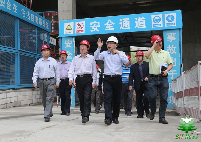 “五一”劳动节前夕, 党委书记张炜一行到国防科技园工地视察指导工作,并慰问了奋战在一线的建设人员。同行人员有常务副校长杨宾、副校长赵平、副校长李和章,资产经营公司、基建处、财务处、后勤集团负责人,中建八局(北京)、承建单位、监理单位等有关部门的负责人。视察施工现场后,资产公司、工程承建单位、监理单位、项目部负责人就工程管理、工程进度、工程监理和工程建设等情况进行了汇报。杨宾、赵平和李和章分别对后续工作提出了要求和部署。