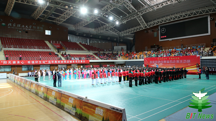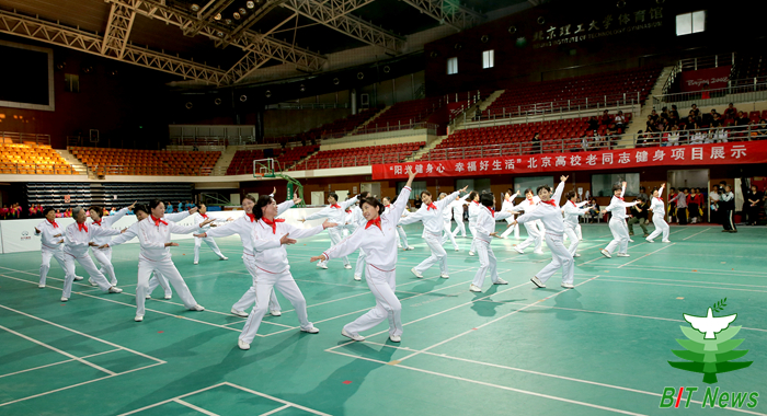 本次健身项目展示活动中有来自北京地区22所高校和北京教育老干部活动中心的23支代表队800余位离退休老同志参加,所展示的老同志健身活动形式多样,涵盖健身操、太极拳、扇子舞、交谊舞、广场舞等。老同志们精神矍铄,盛装华服,载歌载舞,展示活动精彩纷呈、高潮迭起,活动现场掌声不断。beat365老年健身队在离退休工作处的组织下,经过为期一个月的辛苦排练,打造出既时尚流行又强身健体的广场舞《最酷小苹果》,赢得了现场评委和观众们的好评,展现了beat365老同志的昂扬的精神风貌。