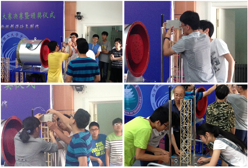 此次大赛的题目为“风力发电塔架结构模型设计与制作”,要求参赛选手用给定的竹皮和502胶两种材料设计、制作一个缩小版的风力发电塔架结构,该结构外轮廓尺寸高度为800mm,平面尺寸不大于100mm×100mm,塔架顶部支撑由组委会提供的机舱模型,机舱重量预赛为10kg, 决赛为12kg。所有模型将经过三项加载试验,一级为机舱静载、二级和三级为风载试验,风力相当于8级风。顺利通过加载者,依据模型质量,从轻至重排列名次,确定最终获奖名单。