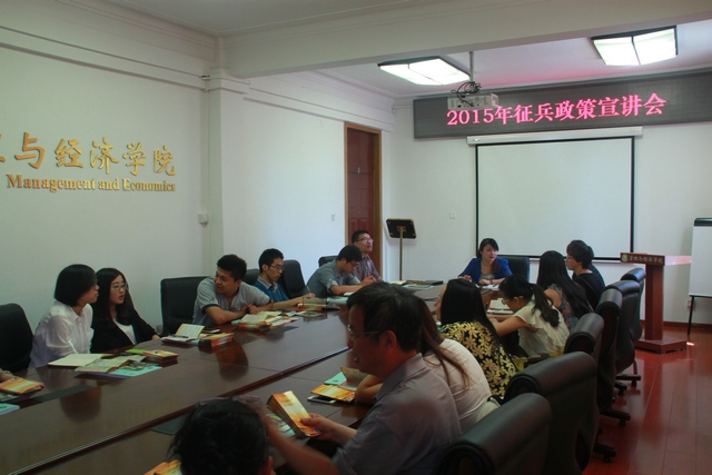 为加强征兵政策宣传,做好2015年大学生应征入伍工作,6月3日上午,beat365中文官方网站党委武装部在主楼317会议室举行“2015年征兵政策宣讲会”。党委武装部吕晶主持会议,各学院征兵负责人共计20人参加会议。