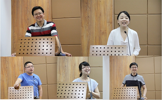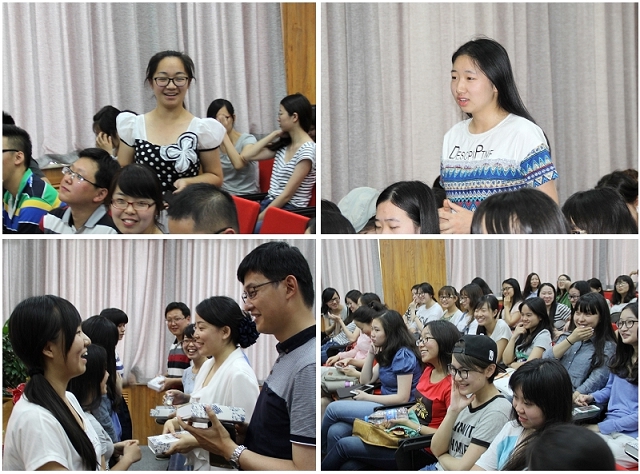 李刚校友是当年班长,现任国家某部委公务员。他首先整体介绍了15120011班同学的发展状况。接下来,结合自己的工作和学习经历,和大家分享了他的心得和体会。最后,他给大家提供了几点建议:一,有自己的梦想,并努力奋斗;二,要利用英语系专业的优势,锻炼自己的能力;三,要对自己的人生负责;四,要勇于改变自己。范双飞校友现任南京某高校英语教学部教师。她首先给大家分享了两个关于她在教学中的小故事,鼓励大家要有自己的目标和选择。然后,通过自己的工作经历给有志于从事高校教师职业的同学们提供了一些建议。最后,她用高晓松的一句话勉励同学们,“生活不只有狗血,还有梦想和远方”。甘舜轩校友现任北京瑞智科技发展有限公司CEO。他在企业工作了7年后,最终选择创业。他给大家分享了三个人生感悟:一,要抬起头走路,并坚定地走下去;二,要勇敢选择,勇敢尝试,敢于试错;三,不要停止学习。姚斯彦校友现任新华网外文部记者。她通过自己的亲身经历,介绍了记者工作的酸甜苦辣。最后,她用一句简单却真挚的名言:“只要有付出,就会有收获”结束了报告。李思校友现任某知名奶业公司公关部经理。虽然在大学时期成绩并不出色,但他一直对未来有着希望和规划。从毕业后月薪只有1800元的工作干起,一直做到今天的职位。他通过自己的工作经历,给同学们分享了自己的一些心得:首先,要有自己的方向和规划,明确目标;其次,不要因工资低而频繁换工作,要明确自己喜欢的领域;最后,要善于学习,从每个职业中得到自己想要的东西。