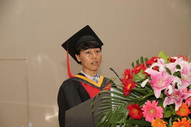 获得学校优秀博士论文奖的钱红梅同学作为毕业生代表发言。她代表全体毕业生向辛勤培育他们的全体教师表达了诚挚的感谢,并回忆了求学和发表论文的艰辛却喜悦的过程。她坚信风雨后是阳光的灿烂,虽然离别在即,但师生之间情谊必定地久天长。