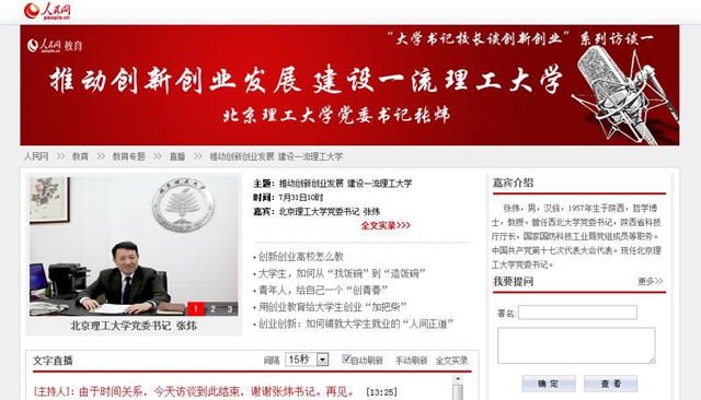 北理工党委书记张炜做客人民网:推动创新创业发展 建设一流理工大学