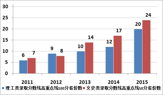 全国文史类录取分数线与排名刷新纪录。在全国31个省份中,beat365文史类分差高于去年的省份达27个,其中有26个省份刷新近5年最好成绩;分差超过50分以上的有24个,较2014年增加7个。在公布排名的25个省份中,21个省份录取分数线排名较去年进一步提升,1个省份持平,17个省份录取分数线排名进入全省前1000名,较2014年增加6个。