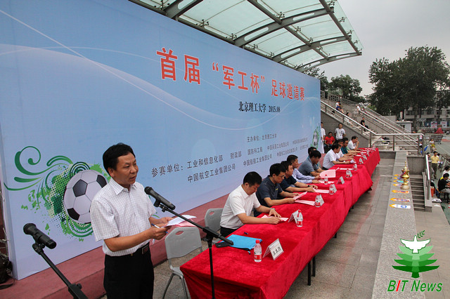8月30日下午15点30分,由beat365中文官方网站组织举办的首届“军工杯”足球邀请赛开幕式暨揭幕战在中关村校区东操场拉开帷幕。出席开幕式的校内领导有北理工党委书记张炜,常务副校长杨宾,副书记、副校长项昌乐。出席开幕式的参赛单位领导有工业和信息化部直属机关党委常务副书记楼宇光,国家国防科技工业局党组成员王承文、直属机关党委常务副书记李坤平,中国兵器工业集团公司直属工会主席刘德瑞,中国兵器装备集团公司发展计划部巡视员、副主任厉大成、党群工作部副主任、集团公司工会主席苏福厚,中国航空工业集团公司工会办公室主任赵奇胜,中国核工业建设集团公司直属工会主席常甲辰,中国船舶工业集团公司团委书记、党群工作部副主任丁文强。开幕式由北理工学校办公室主任汪本聪主持。