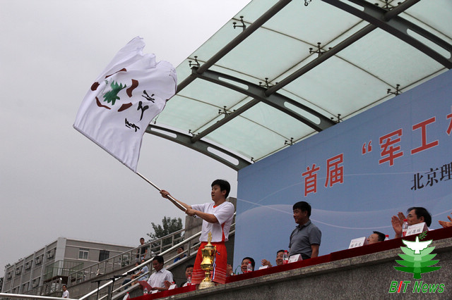 王承文为来自北理工的“军工杯”足球运动员代表授予“军工杯”足球赛旗帜。