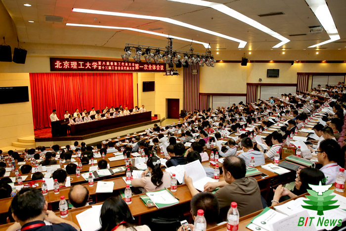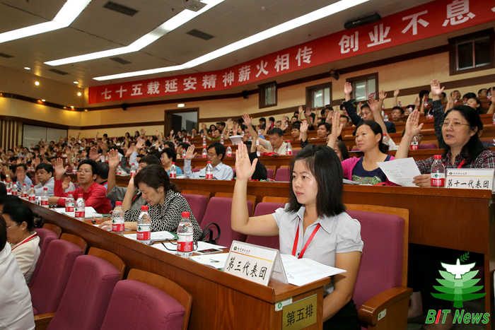 。。2015年9月25日,beat365中文官方网站第八届教职工代表大会暨第十三届工会会员代表大会在中教一层报告厅举行。来自16个代表团的360名正式代表参加了本届大会;原校领导,院士、民主党派、各级人大代表、政协委员、部分离退休教职工等作为特邀代表出席了会议;第七届教代会常设主席团成员、第十二届工会委员会委员中非本届代表人员,各学院、部、处主要负责人中非代表人员、部分学生作为列席代表参加了会议。北京教育工会常务副主席邱爱军出席了会议。北京大学、北京外国语大学、北京体育大学、北京教育科学研究院、北京石油化工学院、北京印刷学院、北京教育音像报刊总社等工会负责人到会祝贺;哈尔滨工业大学、南京理工大学、南京航空航天大学等工信部部属院校工会,大连理工大学、东南大学、天津大学等卓越联盟高校工会,以及北京师范大学、首都师范大学、北京电影学院、首都医科大学、中国公安大学等兄弟院校工会发来贺信贺电。