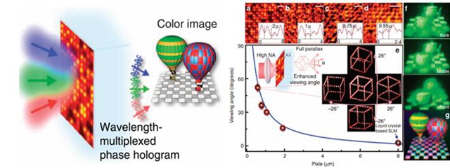 今年年初,项目组刘娟教授等人与澳大利亚斯威本科技大学的Min Gu院士研究组合作,首次实现了亚波长像素尺寸的可擦写全息显示器件,可用于大视场角彩色全息三维显示。通过超小聚焦的飞秒激光光束将氧化石墨烯还原,改变其折射率,再现的全息三维图像的视场角比以往技术增大一个数量级,并提出了动态彩色全息三维显示的可行性方案。该项研究成果于今年4月发表于Nature子刊《自然通讯》(Nature Communications,6, 6984, 2015)。