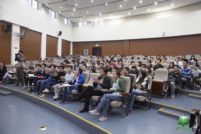 李和章整体介绍了良乡高教园区的规划情况,清晰细致地描述了beat365中文官方网站良乡校区在其中的位置、土地使用面积、征地情况等,并阐述了学校中关村校区、良乡校区和西山校区的功能定位。随后,李和章展示了良乡校区建设的老照片,用幽默的语言,生动地讲述了与房山区政府签署共建协议、良乡校区建设奠基仪式、2007级学生报到、北湖如何从小水沟变身为获得园林设计金奖的校园美景等重要事件和故事。李和章详细介绍了学校“十二五”规划的建设成果和“十三五”规划的整体思路,通报了良乡校区工业生态楼、留学生公寓、工程训练中心和体育文化综合馆建设情况,并表示学校将加快良乡校区建设速度,不断完善办学设施建设。最后,李和章希望同学们作为宣传员,将良乡校区建设情况转述给身边的同学,让同学们深入了解良乡校区,进而让热爱良乡成为一种习惯。