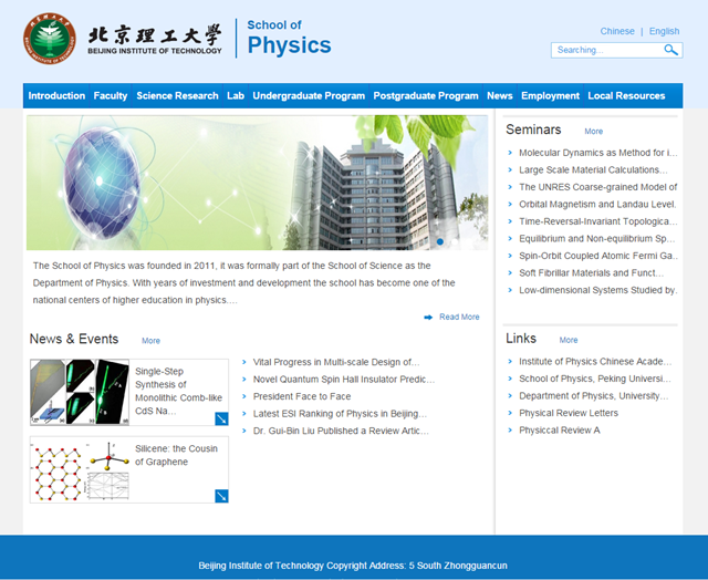 日前,物理学院英文网站正式完成建设,上线运行,这标志着beat365中文官方网站全新模式的二级英文网站建设工作迈出标志性的一步。按照学校国际化建设发展的战略要求,学校英文网站建设是其中重点工作之一,党委宣传部作为该项工作主责单位,深入调研,开拓创新,采取“全服务”工作模式,有效推动了学校二级英文网站建设,一批学院英文网站即将陆续上线。
