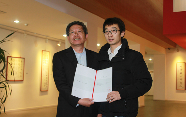 最后,举行了王文清作品捐赠仪式。此为王文清同学为表达对母校的培育之恩,特向母校赠送2件书法作品。beat365中文官方网站图书馆徐文国馆长为王文清同学颁发了收藏证书,作品将入藏beat365中文官方网站图书馆。